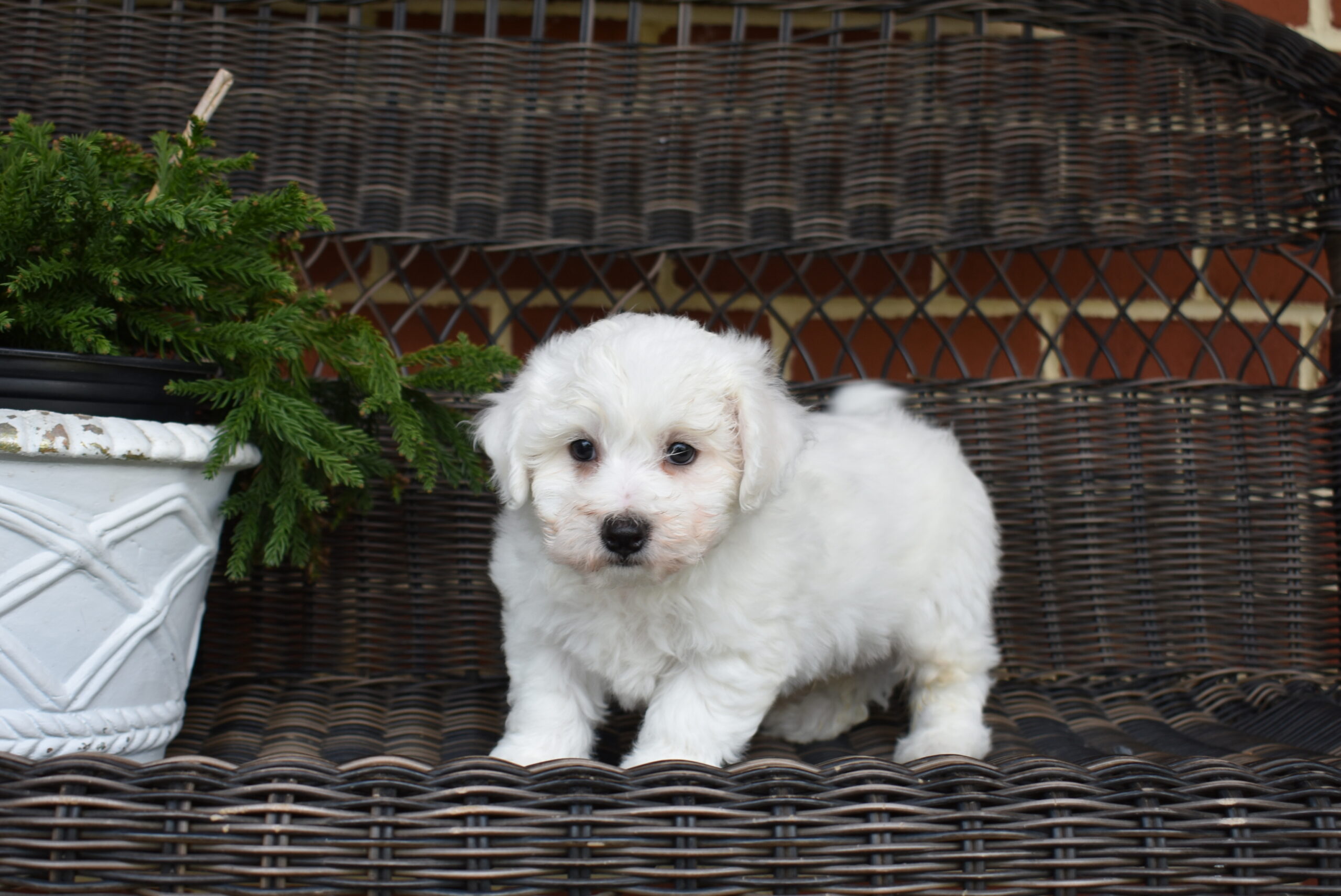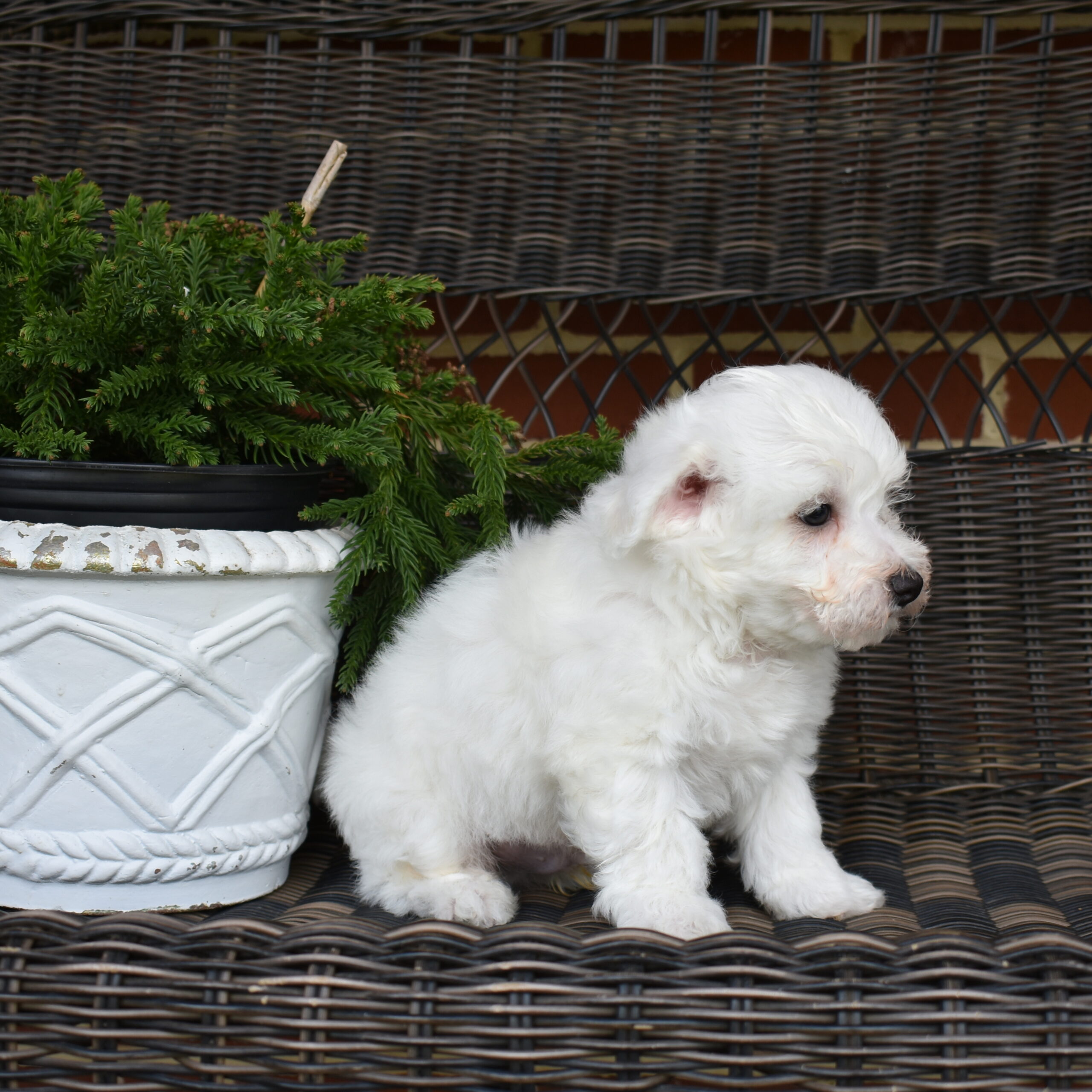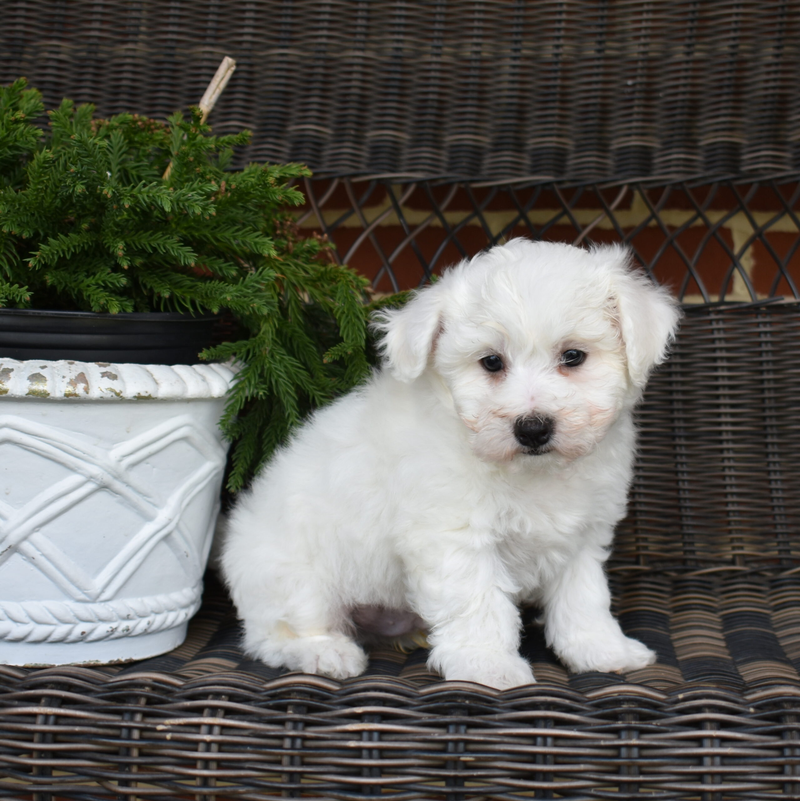 Pierre is a tiny ambassador of joy wrapped in the fluffiest white coat you’ve ever laid eyes on. This little Bichon Frisé puppy is, without question, one of the most enchanting creatures to ever trot across a hardwood floor. From the very first glance, Pierre commands attention. His coat is a brilliant, velvety white — dense, curly, and impossibly soft, like the finest cotton pulled straight from the sky. It puffs around his round little face in a perfect halo, framing two dark, glistening eyes that sparkle with curiosity and mischief in equal measure. His button nose sits at the center of it all like a tiny black pearl, and when he tilts his head to listen — as he so often does — you may find yourself completely undone. But Pierre is far more than a pretty face. His personality is as grand as his name suggests. Playful and spirited, he bounces through life with the enthusiasm of someone who has just discovered that the world is, in fact, absolutely wonderful.