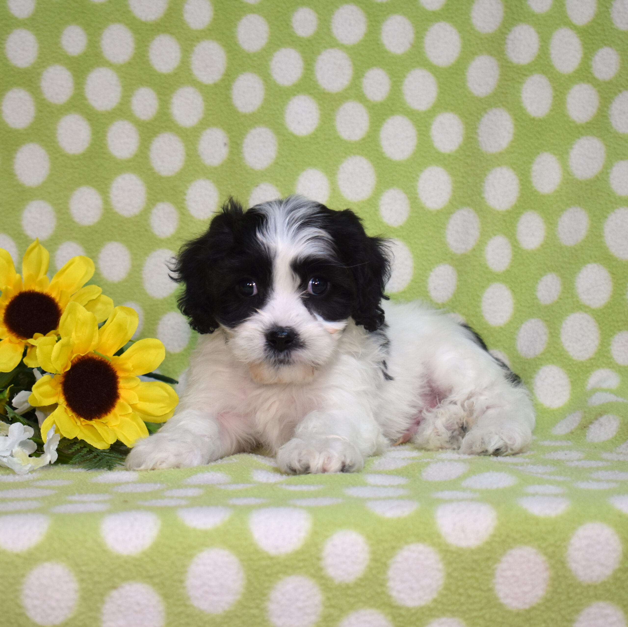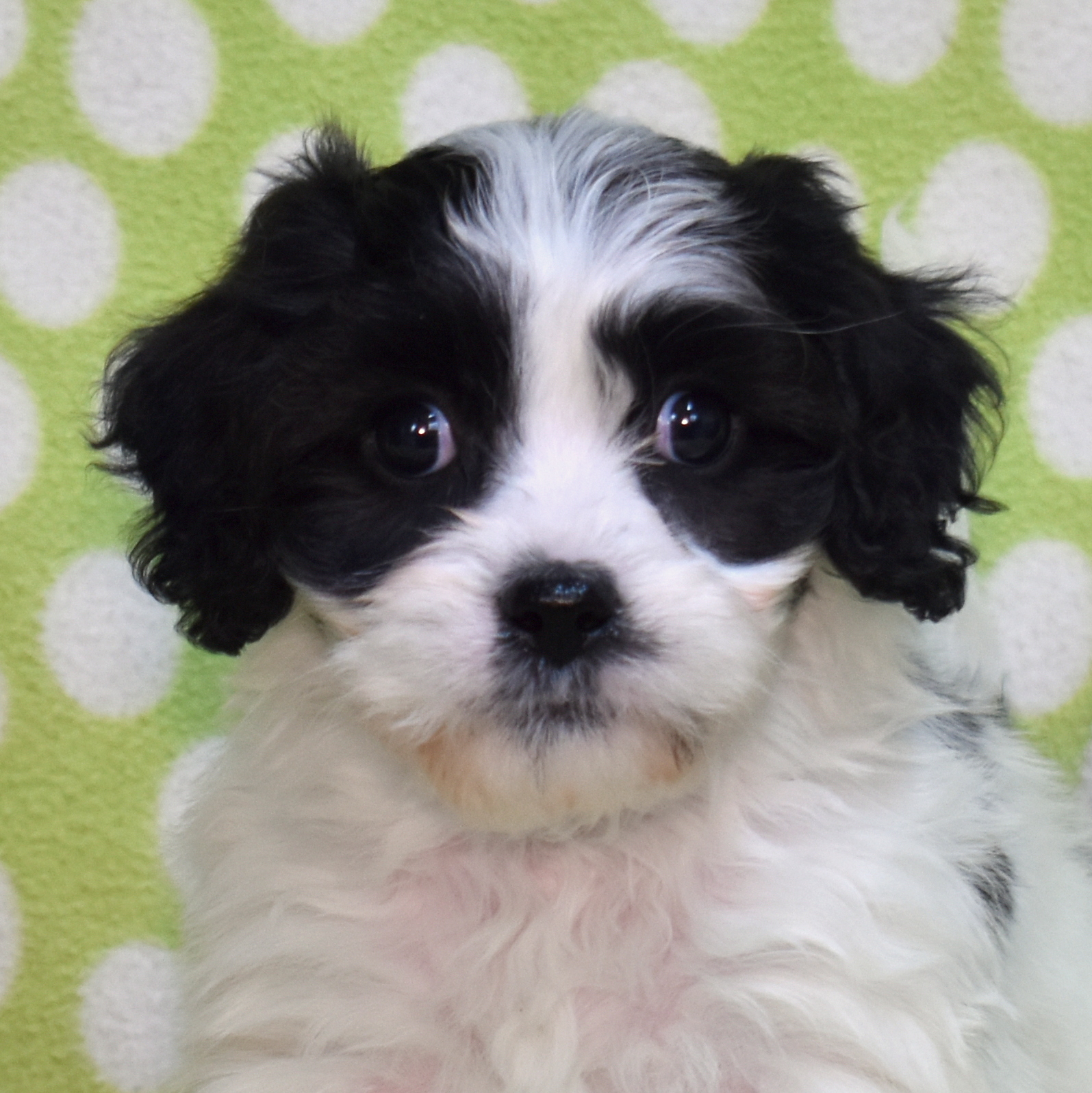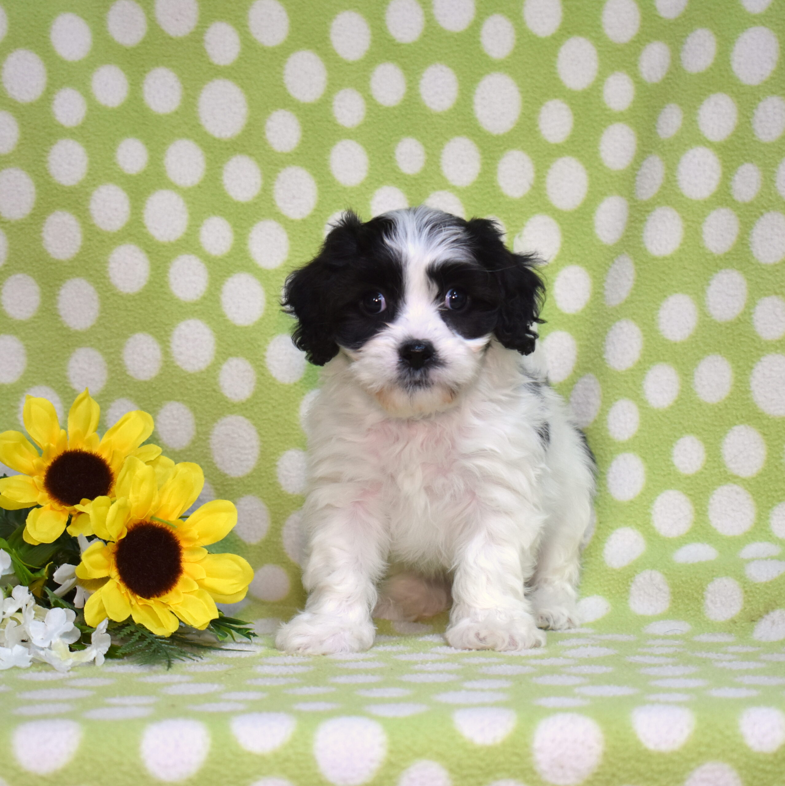 Patch is a cheerful Cavachon whose playful personality makes him impossible not to love. His white coat decorated with charming black markings gives him a distinctive and lovable appearance.